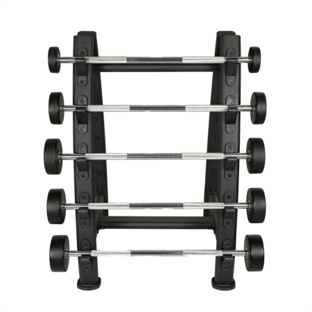 De specialudskårne holdere sikrer optimal stabilitet og beskytter vægtstængerne, hvilket forlænger deres levetid. Stativet er designet til at opbevare vægtstænger effektivt med plads til 5 stænger på hver side, så du sparer plads og skaber et ryddeligt træningsområde.
